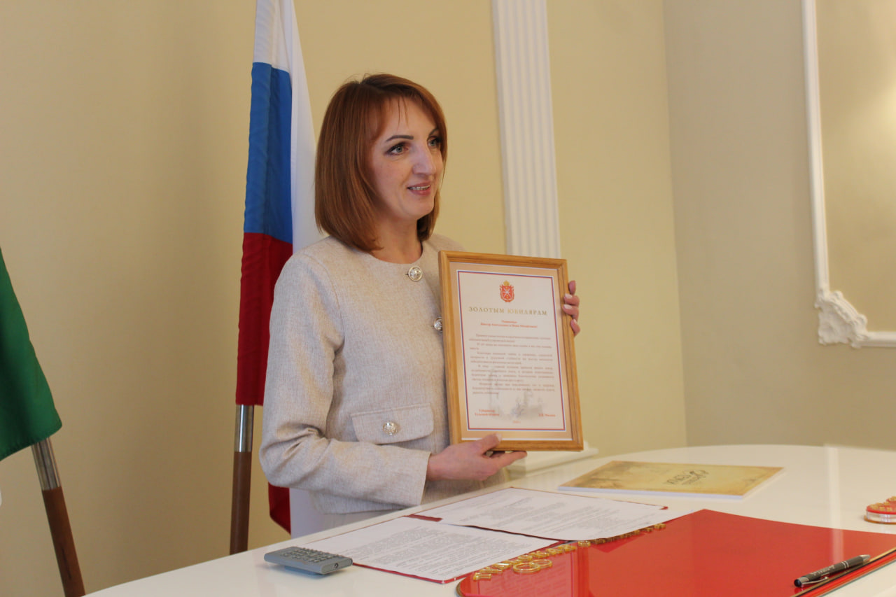 Старший инспектор отдела ЗАГС посёлка Дубна Виктория Букина поздравила супругов со значимой датой и прочитала от имени губернатора Тульской области Дмитрия Миляева поздравительный адрес. Его вместе с памятным подарком «Летопись семьи» вручили юбилярам.