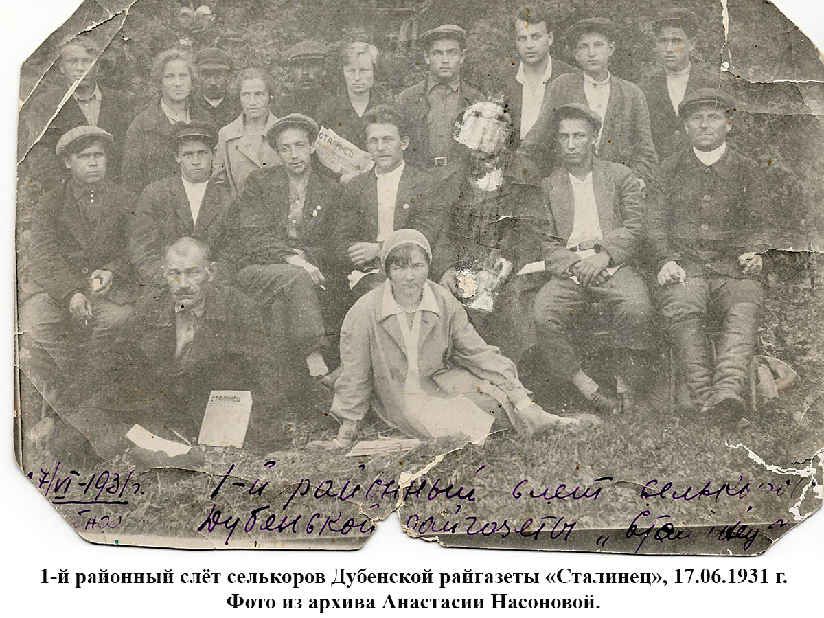 На первом фото изображены участники 1-го районного слёта селькоров Дубенской райгазеты «Сталинец» 17 июня 1931 года, на втором – коллектив редакции и рабочих типографии Дубенской районной газеты (1932 год). В центре в нижнем ряду – Иван Яковлевич Шарончиков, редактор Дубенской районной газеты «Сталинец».