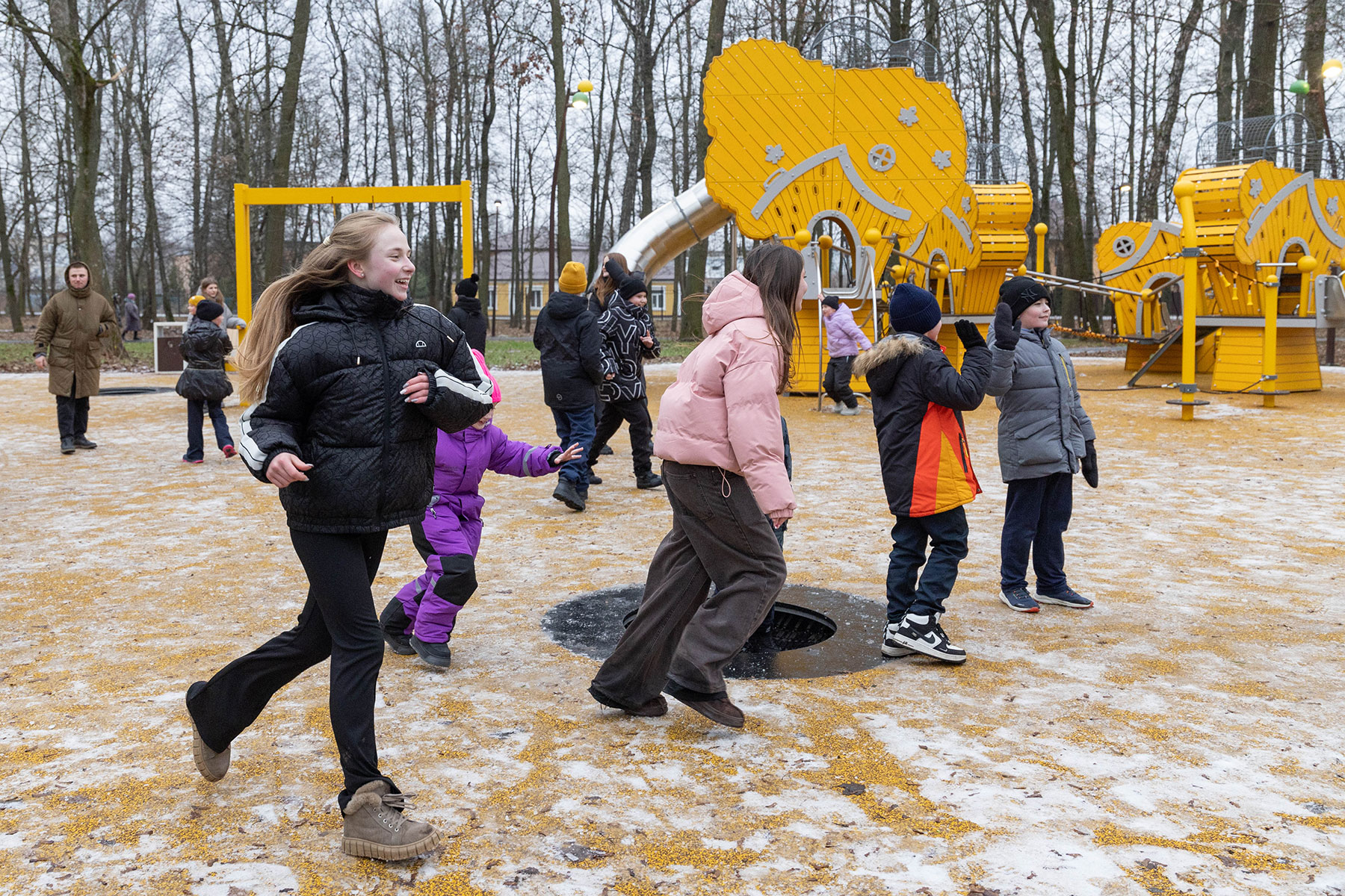Территория парка – 8,4 га – тематически поделена на три функциональные зоны: активного отдыха и досуга, креативного отдыха и прогулочную. Здесь расположены две игровые площадки для ребят разных возрастов. Они оформлены в стилистике осеннего и летнего леса.